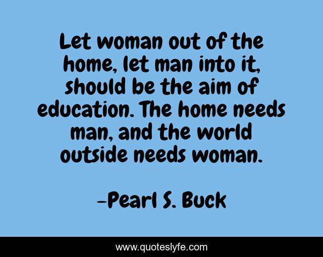 This page presents the quote "Let woman out of the home, let man into it, should be the aim of education. The home needs man, and the world outside needs woman.". Author of this quote is Pearl S. Buck. This quote is about home, woman, man,.