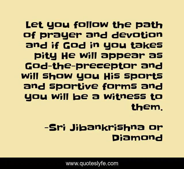 This page presents the quote "Let you follow the path of prayer and devotion and if God in you takes pity He will appear as God-the-preceptor and will show you His sports and sportive forms and you will be a witness to them.". Author of this quote is Sri Jibankrishna or Diamond. This quote is about god, preceptor, devotion,.