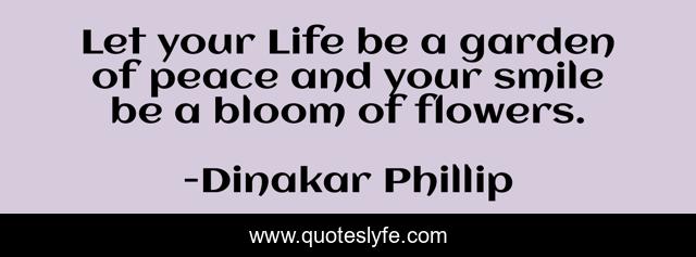 This page presents the quote "Let your Life be a garden of peace and your smile be a bloom of flowers.". Author of this quote is Dinakar Phillip. This quote is about life, flower, love, philosophy, peace, soul, happiness, smile, affection,.