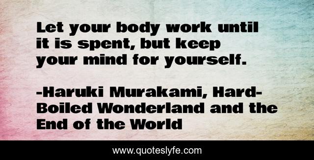 This page presents the quote "Let your body work until it is spent, but keep your mind for yourself.". Author of this quote is Haruki Murakami, Hard-Boiled Wonderland and the End of the World. This quote is about body, work, mind,.