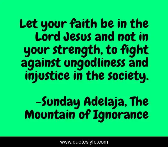 This page presents the quote "Let your faith be in the Lord Jesus and not in your strength, to fight against ungodliness and injustice in the society.". Author of this quote is Sunday Adelaja, The Mountain of Ignorance. This quote is about faith, life, strength, darkness, power, danger, god, people, ignorance,.