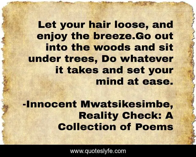 This page presents the quote "Let your hair loose, and enjoy the breeze.Go out into the woods and sit under trees, Do whatever it takes and set your mind at ease.". Author of this quote is Innocent Mwatsikesimbe, Reality Check: A Collection of Poems. This quote is about peace, mind,.