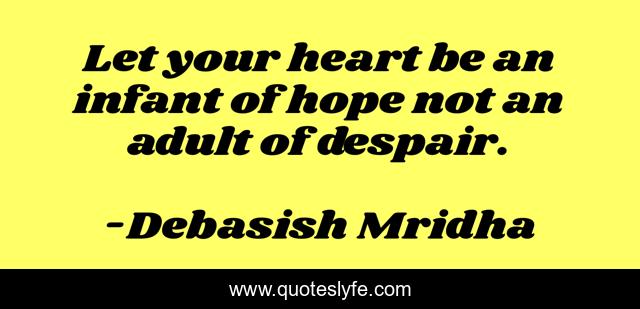 This page presents the quote "Let your heart be an infant of hope not an adult of despair.". Author of this quote is Debasish Mridha. This quote is about philosophy, debasish-mridha, quotes, despair, inspirational, enthusiasm, let-your-heart-hope, debasish-mridha-m-d, hope,.