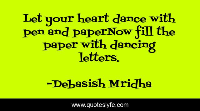This page presents the quote "Let your heart dance with pen and paperNow fill the paper with dancing letters.". Author of this quote is Debasish Mridha. This quote is about heart, life, debasish, letters, dance, mridha, philosophy, poetry, writing,.