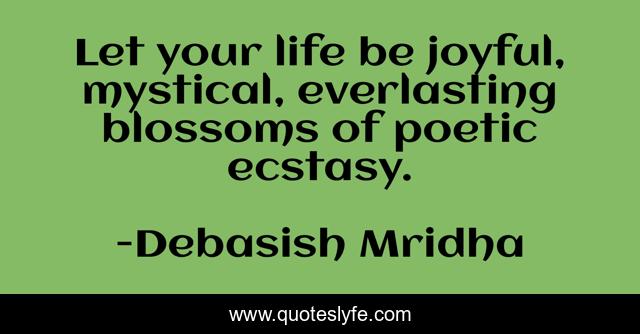 This page presents the quote "Let your life be joyful, mystical, everlasting blossoms of poetic ecstasy.". Author of this quote is Debasish Mridha. This quote is about philosophy, let-your-life-be-joyful, debasish-mridha, debasish-mridha-m-d, quotes, inspirational, enthusiasm, joyful, poetic-ecstasy,.