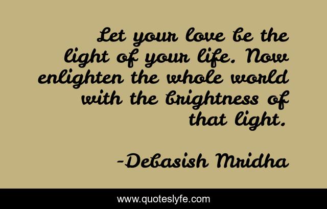 This page presents the quote "Let your love be the light of your life. Now enlighten the whole world with the brightness of that light.". Author of this quote is Debasish Mridha. This quote is about enlighten-the-wholde-world, life, debasish, love, brightness, light, philosophy, debasish-mridha, mridha,.