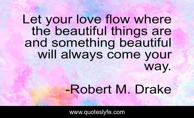 This page presents the quote "Let your love flow where the beautiful things are and something beautiful will always come your way.". Author of this quote is Robert M. Drake. This quote is about beautiful, love, poetry, affection,.