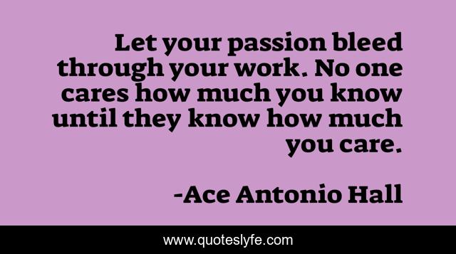 This page presents the quote "Let your passion bleed through your work. No one cares how much you know until they know how much you care.". Author of this quote is Ace Antonio Hall. This quote is about authors, passion, writing,.