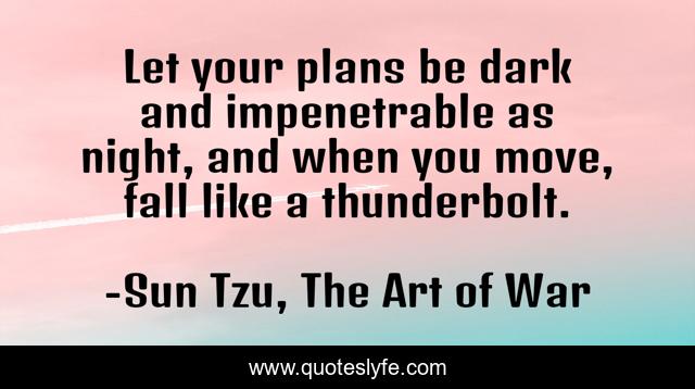 This page presents the quote "Let your plans be dark and impenetrable as night, and when you move, fall like a thunderbolt.". Author of this quote is Sun Tzu, The Art of War. This quote is about war, business, strategy,.