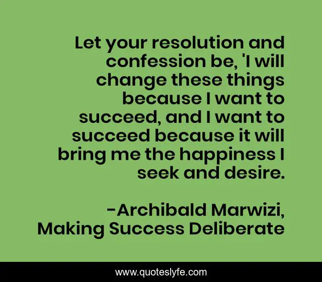 This page presents the quote "Let your resolution and confession be, 'I will change these things because I want to succeed, and I want to succeed because it will bring me the happiness I seek and desire.". Author of this quote is Archibald Marwizi, Making Success Deliberate. This quote is about life, success, behaviour, attitude, legacy, growth, purpose, inspirational, leadership,.