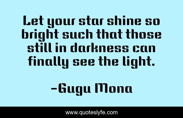 This page presents the quote "Let your star shine so bright such that those still in darkness can finally see the light.". Author of this quote is Gugu Mona. This quote is about shine, light, bright, star, see,.