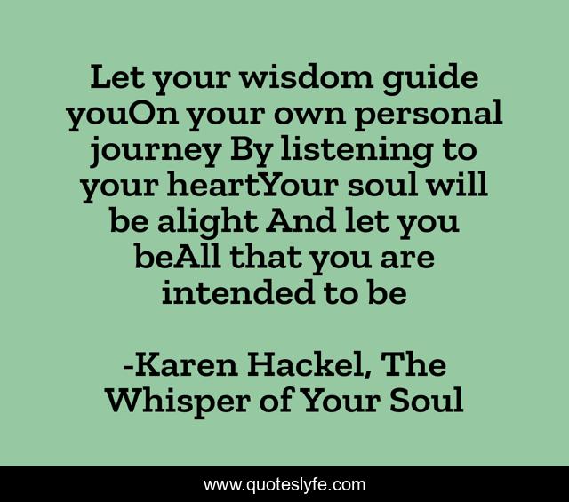 This page presents the quote "Let your wisdom guide youOn your own personal journey By listening to your heartYour soul will be alight And let you beAll that you are intended to be". Author of this quote is Karen Hackel, The Whisper of Your Soul. This quote is about heart, listen, wisdom-inspirational, soul, wisdom,.