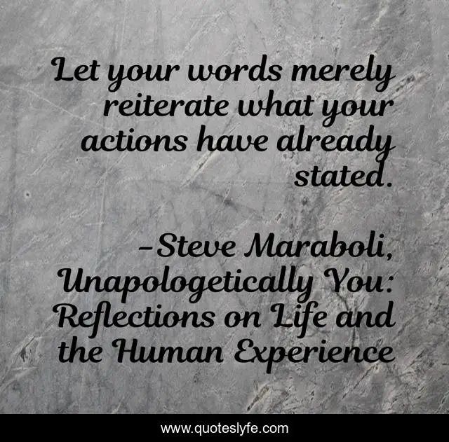 This page presents the quote "Let your words merely reiterate what your actions have already stated.". Author of this quote is Steve Maraboli, Unapologetically You: Reflections on Life and the Human Experience. This quote is about action, life, success,.