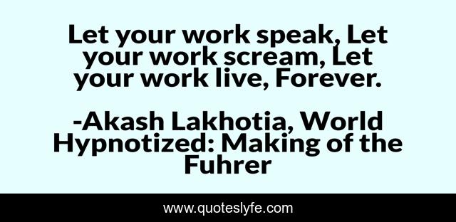 This page presents the quote "Let your work speak, Let your work scream, Let your work live, Forever.". Author of this quote is Akash Lakhotia, World Hypnotized: Making of the Fuhrer. This quote is about life, philosophy, life-lessons, positive, motivational, confidence, wisdom, quotes, optimistic,.