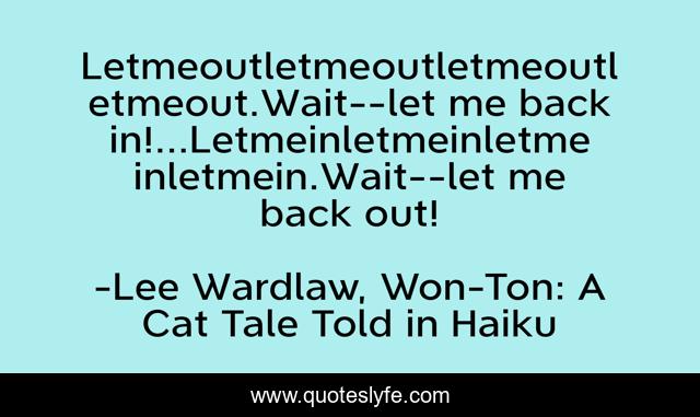 This page presents the quote "Letmeoutletmeoutletmeoutletmeout.Wait--let me back in!...Letmeinletmeinletmeinletmein.Wait--let me back out!". Author of this quote is Lee Wardlaw, Won-Ton: A Cat Tale Told in Haiku. This quote is about cats, haiku,.