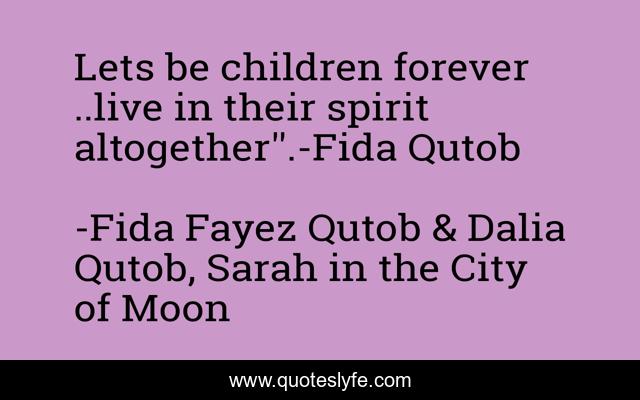 This page presents the quote "Lets be children forever ..live in their spirit altogether''.-Fida Qutob". Author of this quote is Fida Fayez Qutob & Dalia Qutob, Sarah in the City of Moon. This quote is about enthusiasm, inspirational,.