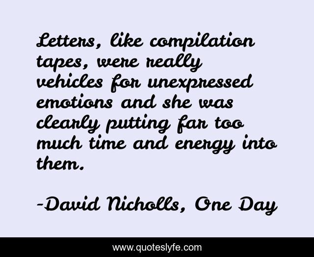 This page presents the quote "Letters, like compilation tapes, were really vehicles for unexpressed emotions and she was clearly putting far too much time and energy into them.". Author of this quote is David Nicholls, One Day. This quote is about compilation-tapes, letters, emotions,.