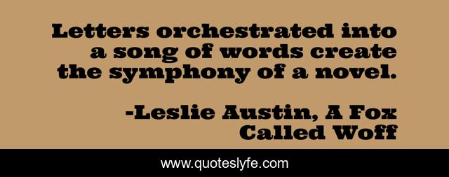 This page presents the quote "Letters orchestrated into a song of words create the symphony of a novel.". Author of this quote is Leslie Austin, A Fox Called Woff. This quote is about writers-on-writing, author, wordplay, writing-process,.