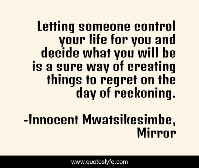 This page presents the quote "Letting someone control your life for you and decide what you will be is a sure way of creating things to regret on the day of reckoning.". Author of this quote is Innocent Mwatsikesimbe, Mirror. This quote is about life, life-lessons, self-growth, motivational, confidence, choices, optimistic, inspirational, positive,.
