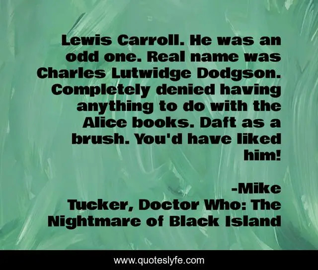 This page presents the quote "Lewis Carroll. He was an odd one. Real name was Charles Lutwidge Dodgson. Completely denied having anything to do with the Alice books. Daft as a brush. You'd have liked him!". Author of this quote is Mike Tucker, Doctor Who: The Nightmare of Black Island. This quote is about doctor-who, alice-in-wonderland-reference, daft, alice-in-wonderland, writers,.