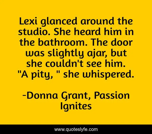 This page presents the quote "Lexi glanced around the studio. She heard him in the bathroom. The door was slightly ajar, but she couldn't see him. "A pity, " she whispered.". Author of this quote is Donna Grant, Passion Ignites. This quote is about dragon-kings, paranormal-romance,.