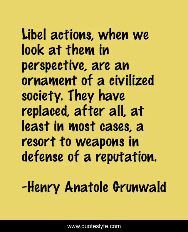 This page presents the quote "Libel actions, when we look at them in perspective, are an ornament of a civilized society. They have replaced, after all, at least in most cases, a resort to weapons in defense of a reputation.". Author of this quote is Henry Anatole Grunwald. This quote is about reputation, perspective,.