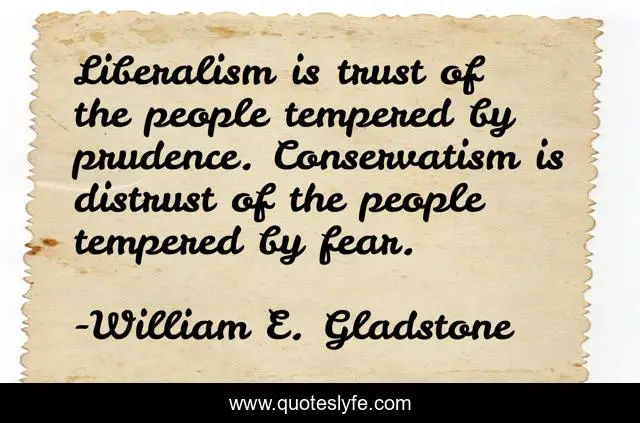 This page presents the quote "Liberalism is trust of the people tempered by prudence. Conservatism is distrust of the people tempered by fear.". Author of this quote is William E. Gladstone. This quote is about politics, trust, people,.