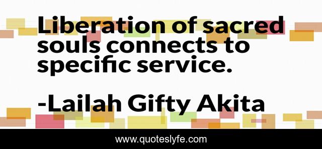 This page presents the quote "Liberation of sacred souls connects to specific service.". Author of this quote is Lailah Gifty Akita. This quote is about service, souls, calling, liberation, deliverance, inspirational, enthusiasm, mission,.