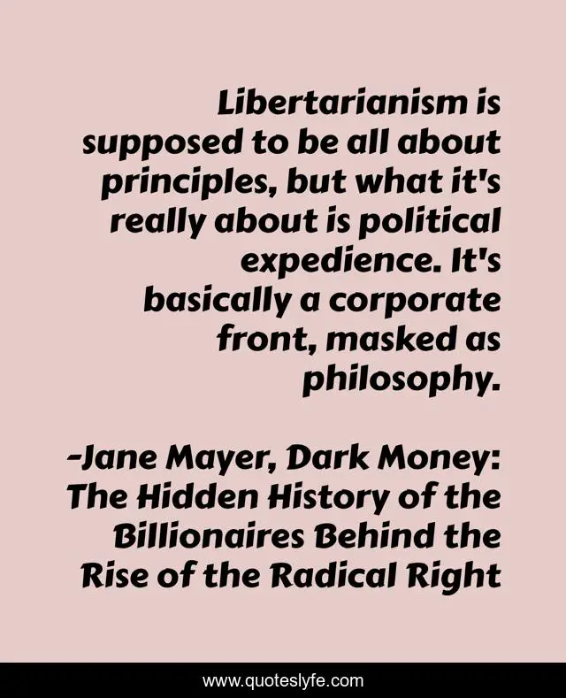 This page presents the quote "Libertarianism is supposed to be all about principles, but what it's really about is political expedience. It's basically a corporate front, masked as philosophy.". Author of this quote is Jane Mayer, Dark Money: The Hidden History of the Billionaires Behind the Rise of the Radical Right. This quote is about politics, politics-of-the-united-states,.