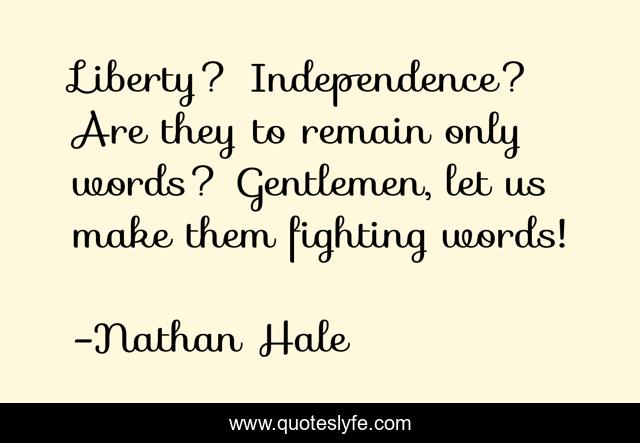 This page presents the quote "Liberty? Independence? Are they to remain only words? Gentlemen, let us make them fighting words!". Author of this quote is Nathan Hale. This quote is about enthusiasm, patriotism, inspirational,.