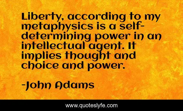 This page presents the quote "Liberty, according to my metaphysics is a self-determining power in an intellectual agent. It implies thought and choice and power.". Author of this quote is John Adams. This quote is about thought, liberty, choice,.