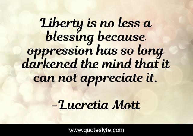 This page presents the quote "Liberty is no less a blessing because oppression has so long darkened the mind that it can not appreciate it.". Author of this quote is Lucretia Mott. This quote is about anarchy, self-knowledge, brainwashing, collectivism, government, freedom, bigotry, abolitionism, non-aggression-principle,.