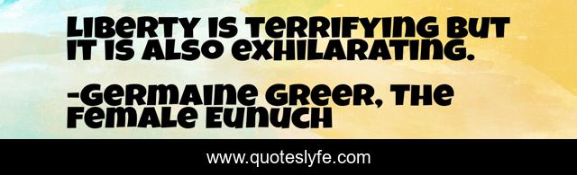 This page presents the quote "Liberty is terrifying but it is also exhilarating.". Author of this quote is Germaine Greer, The Female Eunuch. This quote is about women-s-history, gender-roles, second-wave-feminism, marriage, the-female-eunuch, women-s-literature, germaine-greer, feminism, patriarchy,.