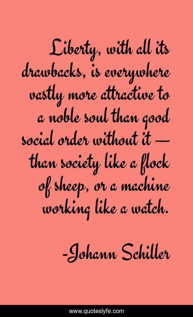 This page presents the quote "Liberty, with all its drawbacks, is everywhere vastly more attractive to a noble soul than good social order without it — than society like a flock of sheep, or a machine working like a watch.". Author of this quote is Johann Schiller. This quote is about freedom, conservatism, liberty, society,.