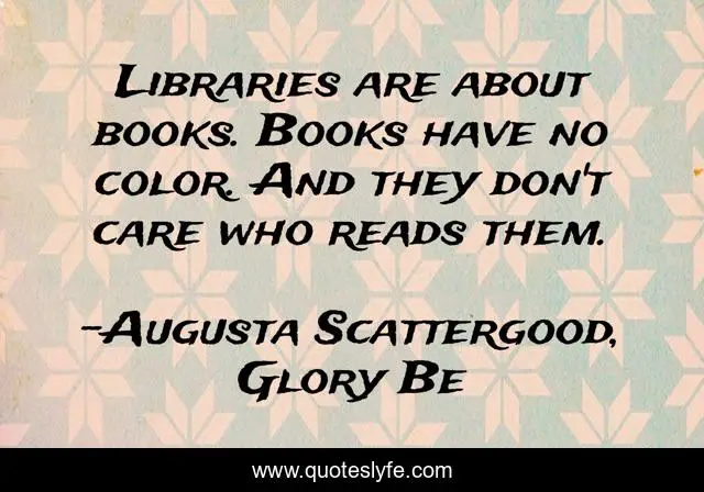 This page presents the quote "Libraries are about books. Books have no color. And they don't care who reads them.". Author of this quote is Augusta Scattergood, Glory Be. This quote is about libraries, civil-rights, books, mississippi-authors, race,.