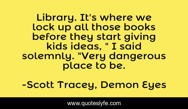This page presents the quote "Library. It's where we lock up all those books before they start giving kids ideas, " I said solemnly. "Very dangerous place to be.". Author of this quote is Scott Tracey, Demon Eyes. This quote is about books, ideas, library, danger,.