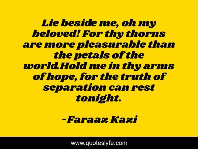 This page presents the quote "Lie beside me, oh my beloved! For thy thorns are more pleasurable than the petals of the world.Hold me in thy arms of hope, for the truth of separation can rest tonight.". Author of this quote is Faraaz Kazi. This quote is about romance, love, poetry, affection, separation,.