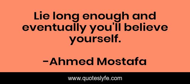 This page presents the quote "Lie long enough and eventually you'll believe yourself.". Author of this quote is Ahmed Mostafa. This quote is about self-deception, lying-to-ourselves, becoming, self-deceit, masks, lying-to-yourself, lying,.
