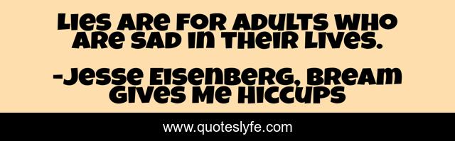 This page presents the quote "Lies are for adults who are sad in their lives.". Author of this quote is Jesse Eisenberg, Bream Gives Me Hiccups. This quote is about lies, adulthood,.