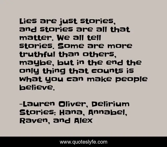 "Lauren Oliver, Delirium Stories: Hana, Annabel, Raven, and Alex Quotes." Quoteslyfe.com, 2025. Fri. 05 Dec. 2025. <https://www.quoteslyfe.com/quote/Lies-are-just-stories-and-stories-are-160106>.