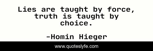 This page presents the quote "Lies are taught by force, truth is taught by choice.". Author of this quote is Homin Hieger. This quote is about lies, force, truth, choice,.