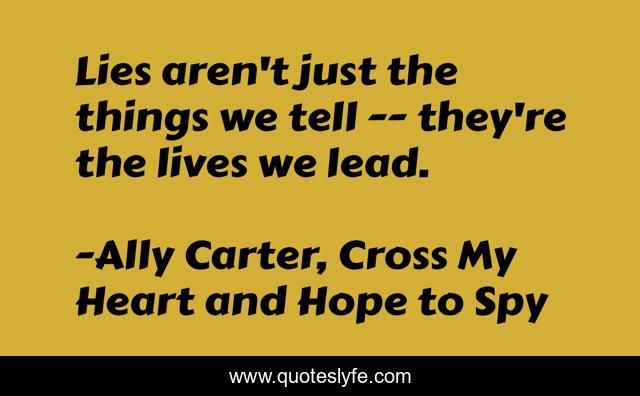 This page presents the quote "Lies aren't just the things we tell -- they're the lives we lead.". Author of this quote is Ally Carter, Cross My Heart and Hope to Spy. This quote is about lies, ally-carter,.