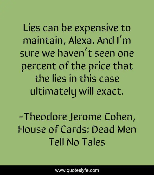 "Theodore Jerome Cohen, House of Cards: Dead Men Tell No Tales Quotes." Quoteslyfe.com, 2025. Fri. 05 Dec. 2025. <https://www.quoteslyfe.com/quote/Lies-can-be-expensive-to-maintain-Alexa-146466>.