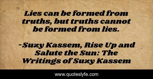 This page presents the quote "Lies can be formed from truths, but truths cannot be formed from lies.". Author of this quote is Suzy Kassem, Rise Up and Salute the Sun: The Writings of Suzy Kassem. This quote is about lies, suzy-kassem, truths,.