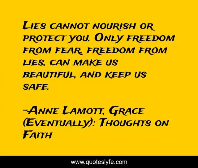 This page presents the quote "Lies cannot nourish or protect you. Only freedom from fear, freedom from lies, can make us beautiful, and keep us safe.". Author of this quote is Anne Lamott, Grace (Eventually): Thoughts on Faith. This quote is about beautiful, beauty, freedom, safe, lies, safety, fear,.