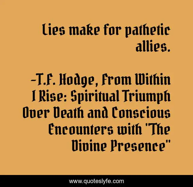 "T.F. Hodge, From Within I Rise: Spiritual Triumph Over Death and Conscious Encounters with "The Divine Presence" Quotes." Quoteslyfe.com, 2025. Tue. 09 Dec. 2025. <https://www.quoteslyfe.com/quote/Lies-make-for-pathetic-allies-167683>.
