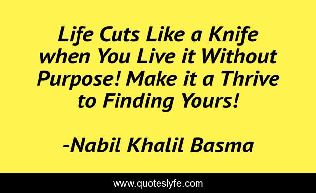 This page presents the quote "Life Cuts Like a Knife when You Live it Without Purpose! Make it a Thrive to Finding Yours!". Author of this quote is Nabil Khalil Basma. This quote is about life, life-and-living,.
