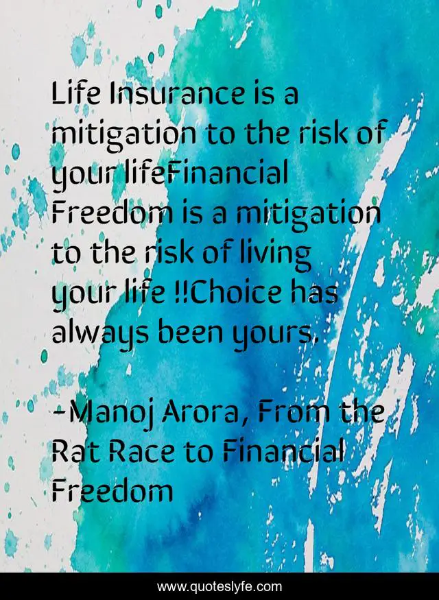 This page presents the quote "Life Insurance is a mitigation to the risk of your lifeFinancial Freedom is a mitigation to the risk of living your life !!Choice has always been yours.". Author of this quote is Manoj Arora, From the Rat Race to Financial Freedom. This quote is about financial-freedom, life, risk,.
