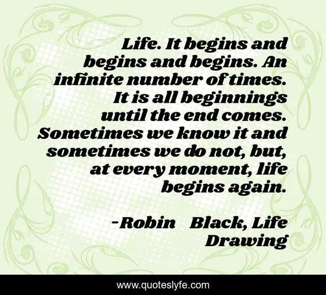 This page presents the quote "Life. It begins and begins and begins. An infinite number of times. It is all beginnings until the end comes. Sometimes we know it and sometimes we do not, but, at every moment, life begins again.". Author of this quote is Robin Black, Life Drawing. This quote is about end, life-beginnings,.