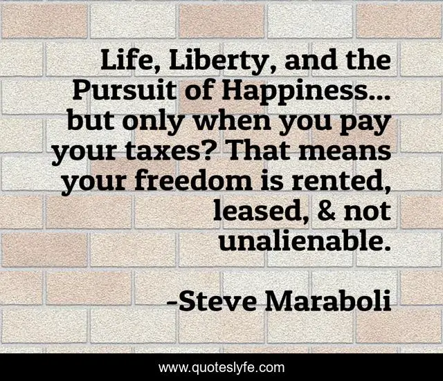 This page presents the quote "Life, Liberty, and the Pursuit of Happiness... but only when you pay your taxes? That means your freedom is rented, leased, & not unalienable.". Author of this quote is Steve Maraboli. This quote is about life, freedom, liberty, taxes, politics, happiness,.
